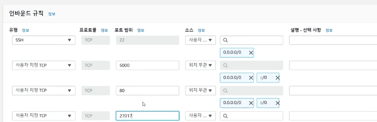 이렇게 포트를 추가해줘야 접속이 가능하다고 ㅜ우리가 돌릴 5000포트 80포트(http의 기본) 27017(몽고db) 추가해준다